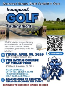 The Greenwood Ranger Golf Tournament will be a double shotgun at 8:00AM and 2:00PM. This is a fundraising tournament for Greenwood youth football team. See below for more information.